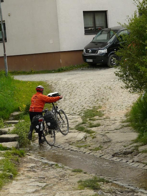 Al heel veel grote fietstochten gemaakt en nog nooit pech gehad. Deze fietstocht gaan we om de beurt naar de fietsenmaker. Vandaag was Piet aan de beurt. Door de zeer slechte onverharde wegen en de zware tassen achterop kreeg hij vandaag een flinke scheur in de velg van het achterwiel. We waren net op weg toen zijn achterwiel wat raar bewoog en aansleepte. Inspectie volgde en het resultaat was dat we naar de eerstvolgende fietsenmaker moesten. Dat lukte al na 3 kilometer. Een soort bedrijf waar je voor alles wat rijdt terecht kunt. Garage, motor-, trekker- benzinepomp en ook fietsenmaker. Gelukkig had de man verstand van zaken. Hij had in de goede maat een nieuw gespaakt wiel met shimano achterkrans. Hij had zelfs tijd om het op dat moment te vervangen. Afgesproken met de andere drie dat ze de route zouden doorfietsen en dat Piet en Leny via een snellere weg ze wel weer zouden inhalen. Na een klein uurtje was de klus geklaard. Piet een glimmende achtervelg, een gesponsord kopje koffie en weer op weg. Net voor de anderen Rothenburg ob der Tauber binnenreden haalde we ze in. Rothenburg is een prachtige stad waar we weer heel wat foto’s hebben gemaakt. Er zijn nog heel wat stadspoorten bewaard gebleven en de kerken en gebouwen zijn het bezichtigen zeker waard. We hadden jammer genoeg niet al te veel tijd maar hier willen we zeker nog eens terugkomen. We reden de stad uit langs de dikke kasteelmuren en prachtige poorten. Daarna een fantastische weg door heuvellandschap met mooie vergezichten. De temperatuur vandaag was heel koud maar met de lange broek aan gaat het goed. Toen het zonnetje er ook een beetje bij kwam werd het wat aangenamer maar het bleef de hele dag rond de 10°. Er is vandaag weer wat gefilmd voor Jan Willem maar soms is er niet genoeg tijd. Onze voorman houdt van een straf tempo en als filmer lig je dan zo achter of sta je buiten adem te filmen. Wij houden heel veel beelden in onze herinnering en we hebben altijd nog de foto’s. Vandaag was het een redelijk lange rit met in het laatste stuk een paar venijnige klimmetjes van 12%. Meer klimmen dan dalen. Frans heeft voor ons een prima onderkomen geregeld boven een slagerij. De wijn daar was heerlijk en het eten nog lekkerder. Wij zijn dus heel tevreden en genieten elke dag.